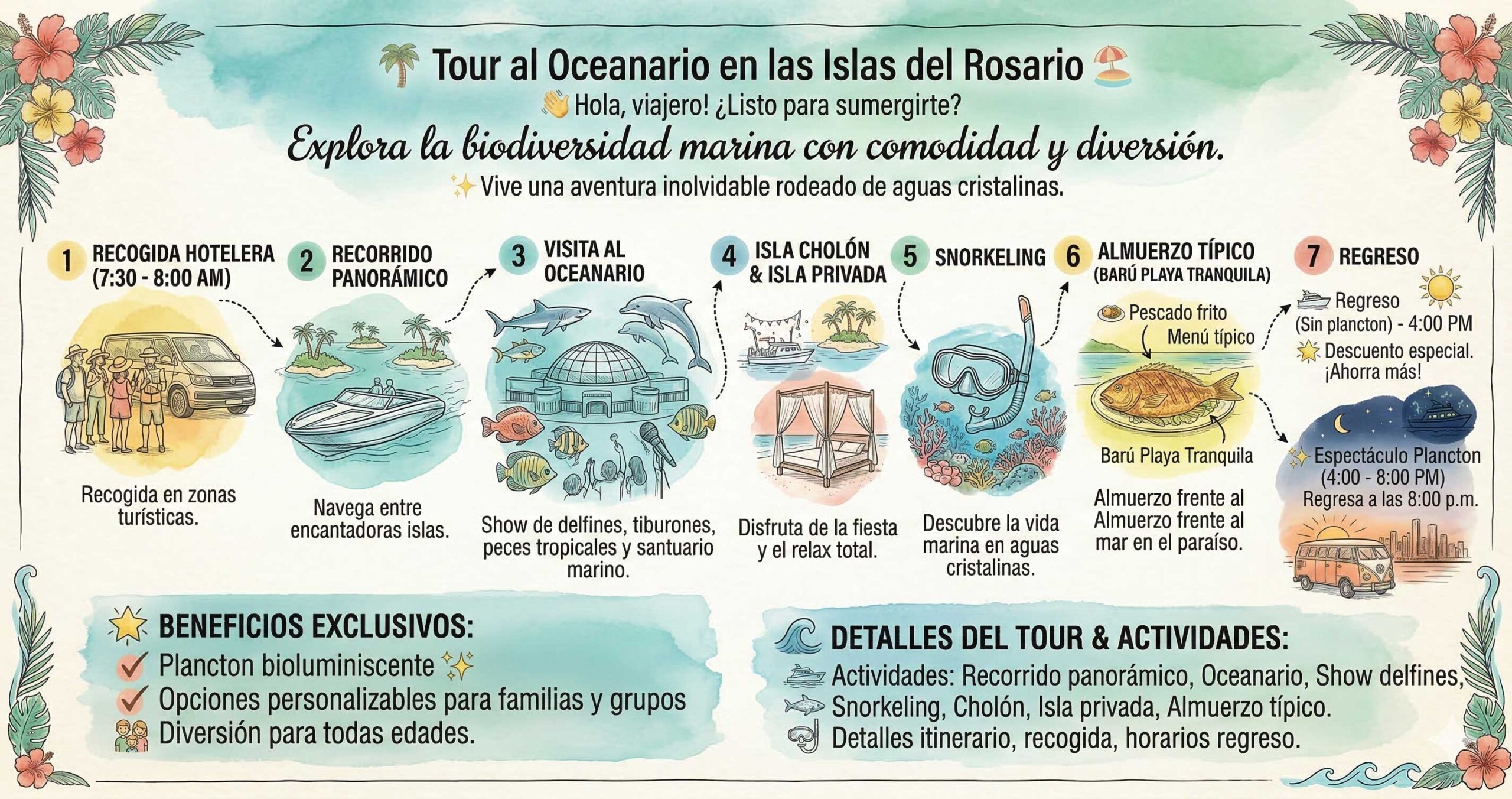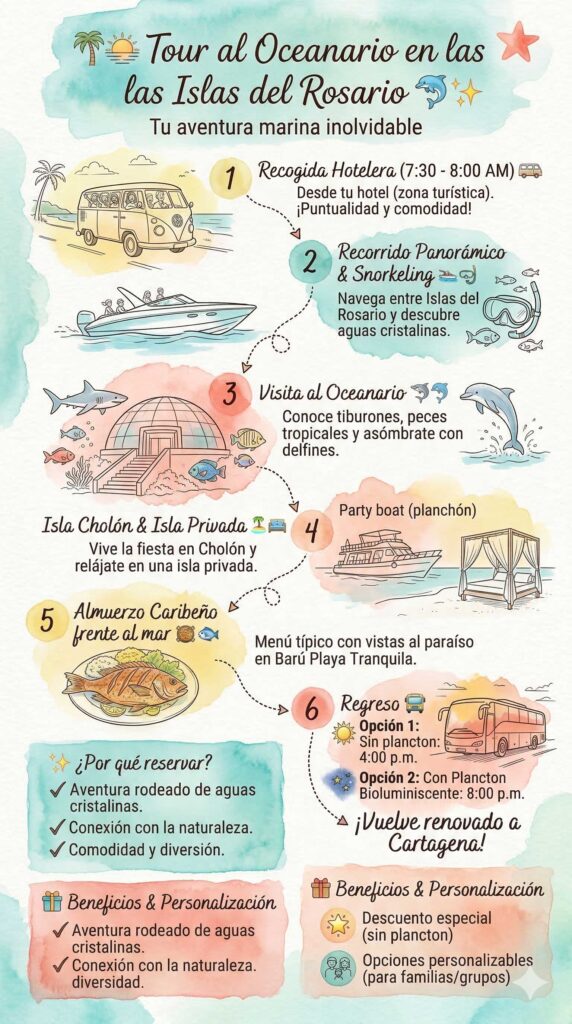 El Tour al Oceanario te invita a explorar el increíble mundo marino del Archipiélago de las Islas del Rosario, disfrutar de paisajes paradisíacos y vivir momentos inolvidables en contacto con la naturaleza. 🌴💦